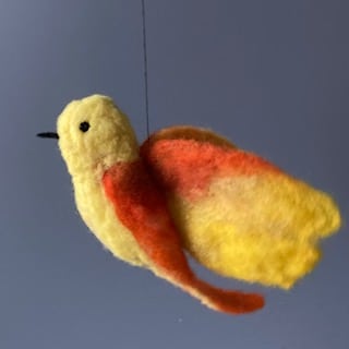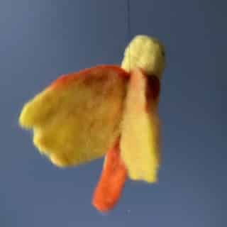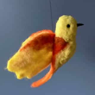 Vogeltje van vilt “dancing and laughing” vertelt over zelfexpressie. Een vrolijk en enthousiast vogeltje dat geniet van dansen.